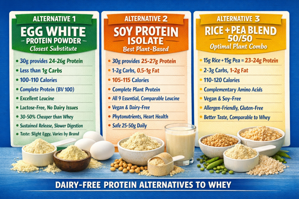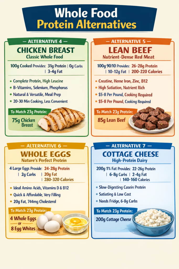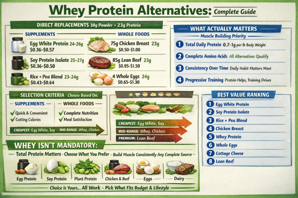 Here’s the complete answer: A 30g serving of whey protein provides 20-25g of protein. This can be replaced by: 30g egg white protein, 30g soy protein isolate, 100g chicken breast, 100g lean beef, 4 whole eggs, or 200g cottage cheese. All provide equivalent protein with complete amino acid profiles. The main differences are digestion speed, cost, convenience, and additional nutrients, not muscle-building effectiveness.
