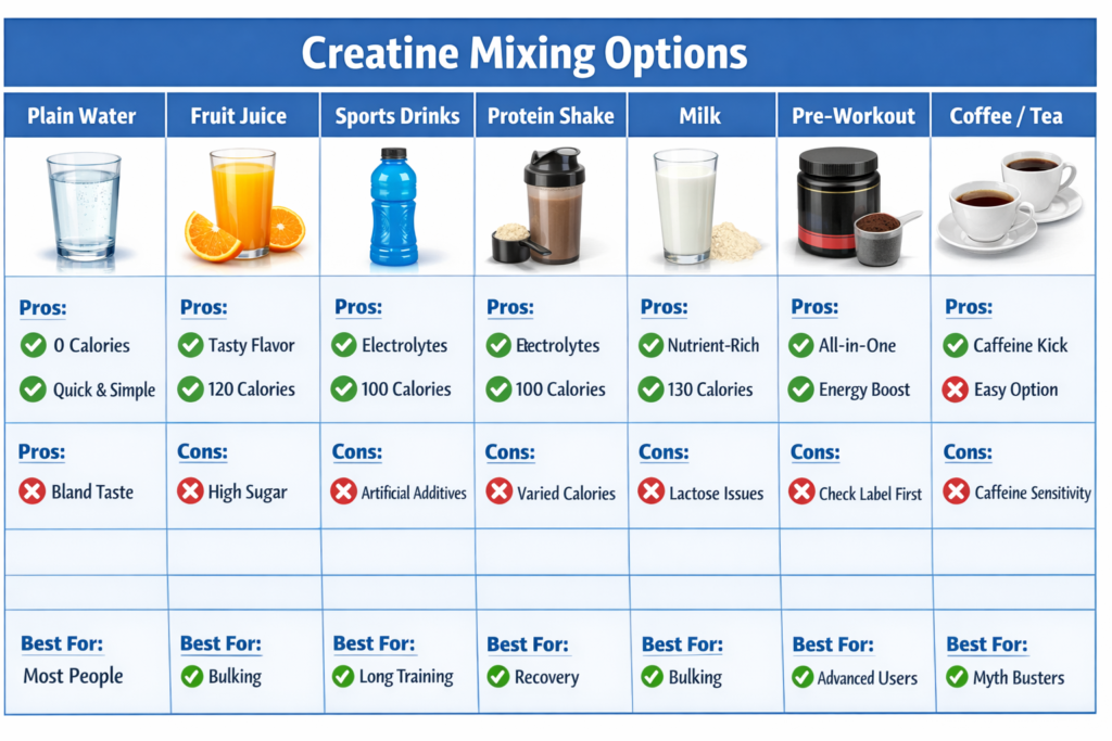 Here’s the reality that will simplify your life: You can mix creatine with virtually any liquid. The specific beverage doesn’t significantly affect absorption or results. What matters is consistency and total daily intake, not what you mix it with.
