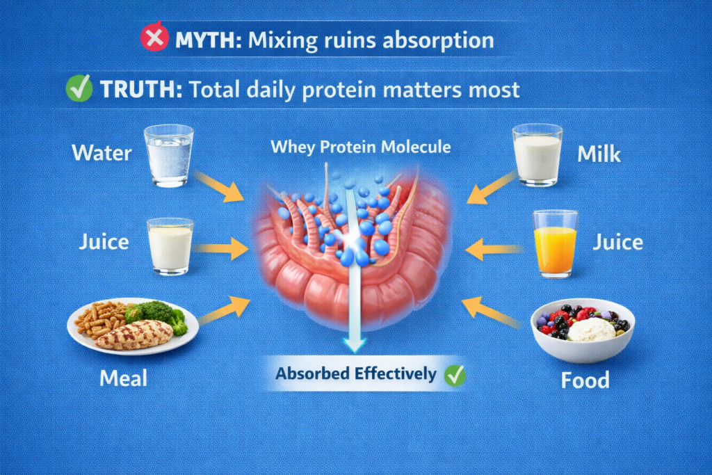 Common fear: “If I mix whey with [milk/juice/food], it will slow absorption and waste the protein!”