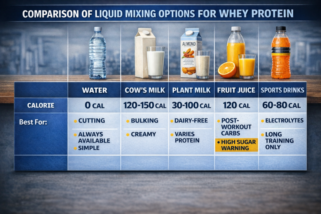 Here’s the truth that will simplify your life: You can mix whey protein with virtually any liquid or food without harming absorption. The best option depends on your specific goals (cutting, bulking, or maintenance), taste preferences, and convenience needs. Water works perfectly fine, but adding other ingredients can enhance nutrition, improve taste, and help you hit macro targets more easily.