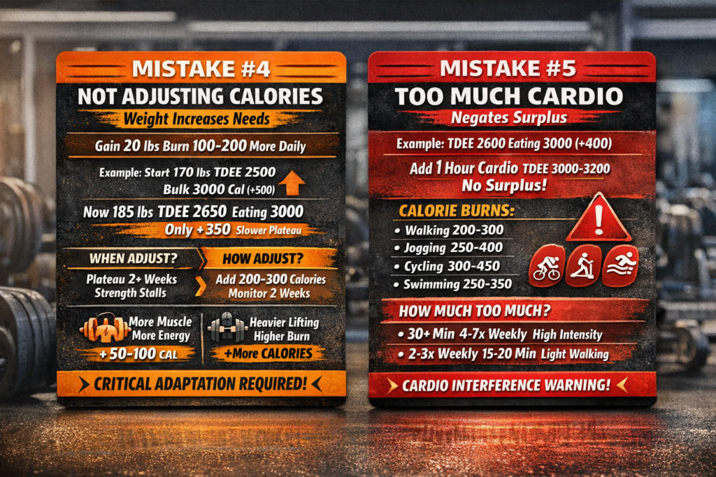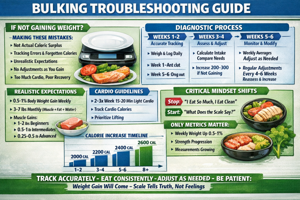 Here’s the uncomfortable truth: If you’re not gaining weight while bulking, you’re not in a caloric surplus, regardless of how much you think you’re eating. The most common culprits are underestimating calorie intake, tracking errors, metabolic adaptation without adjustment, unrealistic timelines, and excessive cardio negating your surplus. Fix these issues and weight gain becomes inevitable.