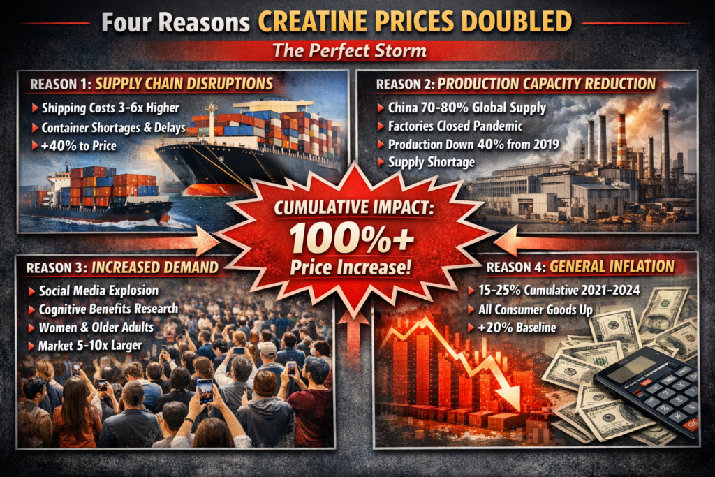 The truth is more complex. Creatine prices increased 100%+ from 2022 to 2024 due to four main factors: pandemic supply chain disruptions (still ongoing), production capacity reductions in China (main global supplier), massive demand increases (more people using creatine than ever), and general inflation. This created a perfect storm that sent prices skyrocketing.