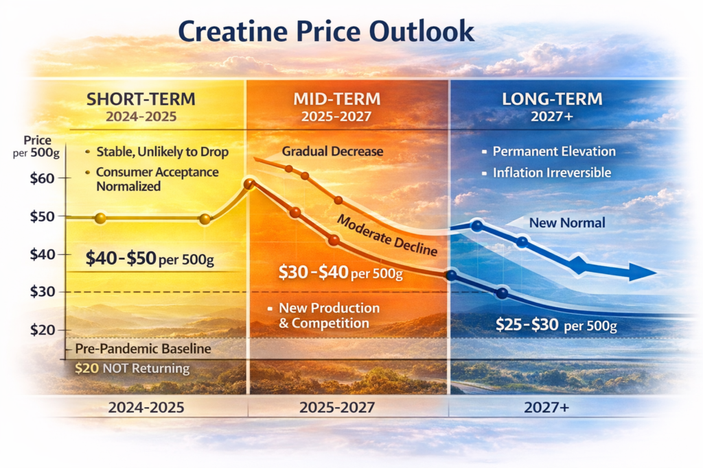 [7] Caloong Chemical Co. — China Creatine Price Analysis, 2025 Creatine monohydrate price trend 2025 — 2021 price peak at RMB 41,200/ton caused by raw material shortages; four new Chinese production projects launched 2023-2024; overcapacity now primary driver of falling prices; China production capacity reached 28,949 tons in 2021 and continued expanding; 30% year-on-year price decline in 2025 https://caloongchem.com/creatine-monohydrate-price-trend-2025-market-analysis-historical-data-future-outlook/
