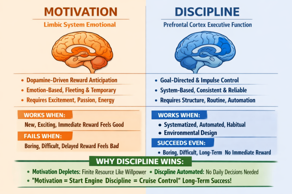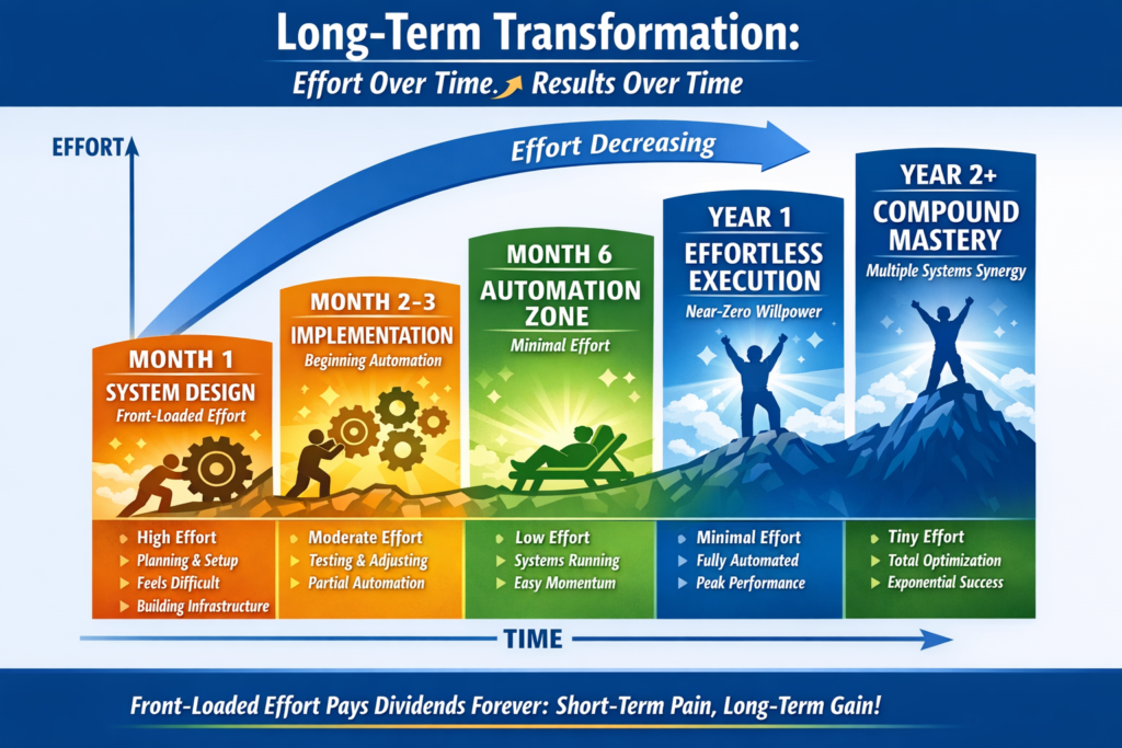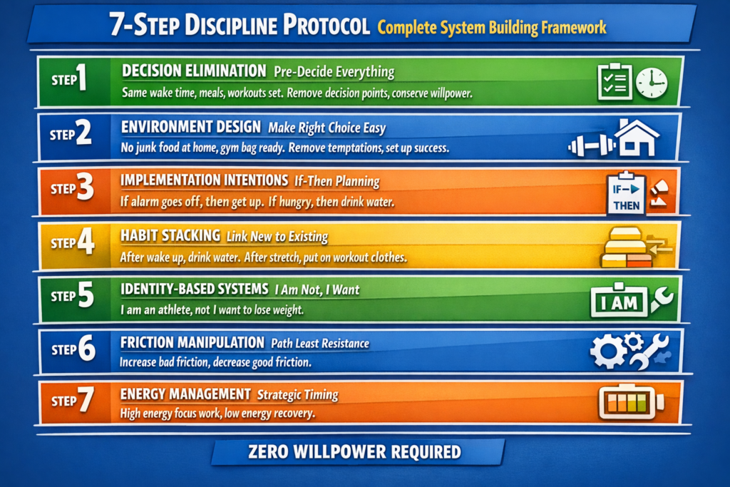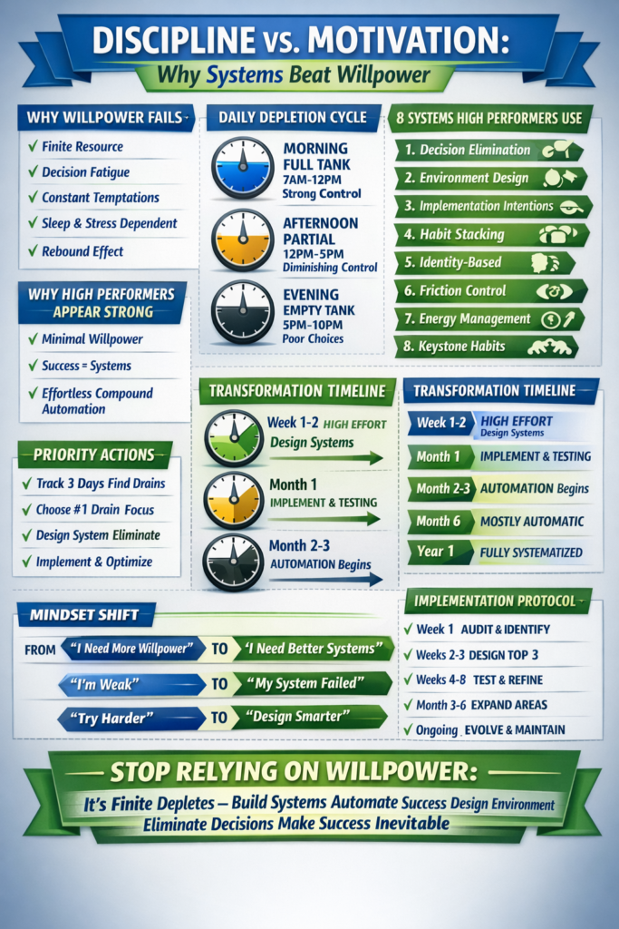 In this comprehensive guide, I’ll explain why willpower fails (the depletion mechanism), reveal the 8 systems high performers use instead (zero willpower required), show you how to design your environment for automatic success (remove decision points), provide the complete automation protocol (systematize everything), and explain why “trying harder” makes everything worse (paradoxical effect).
